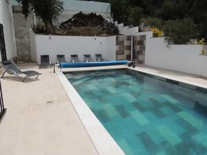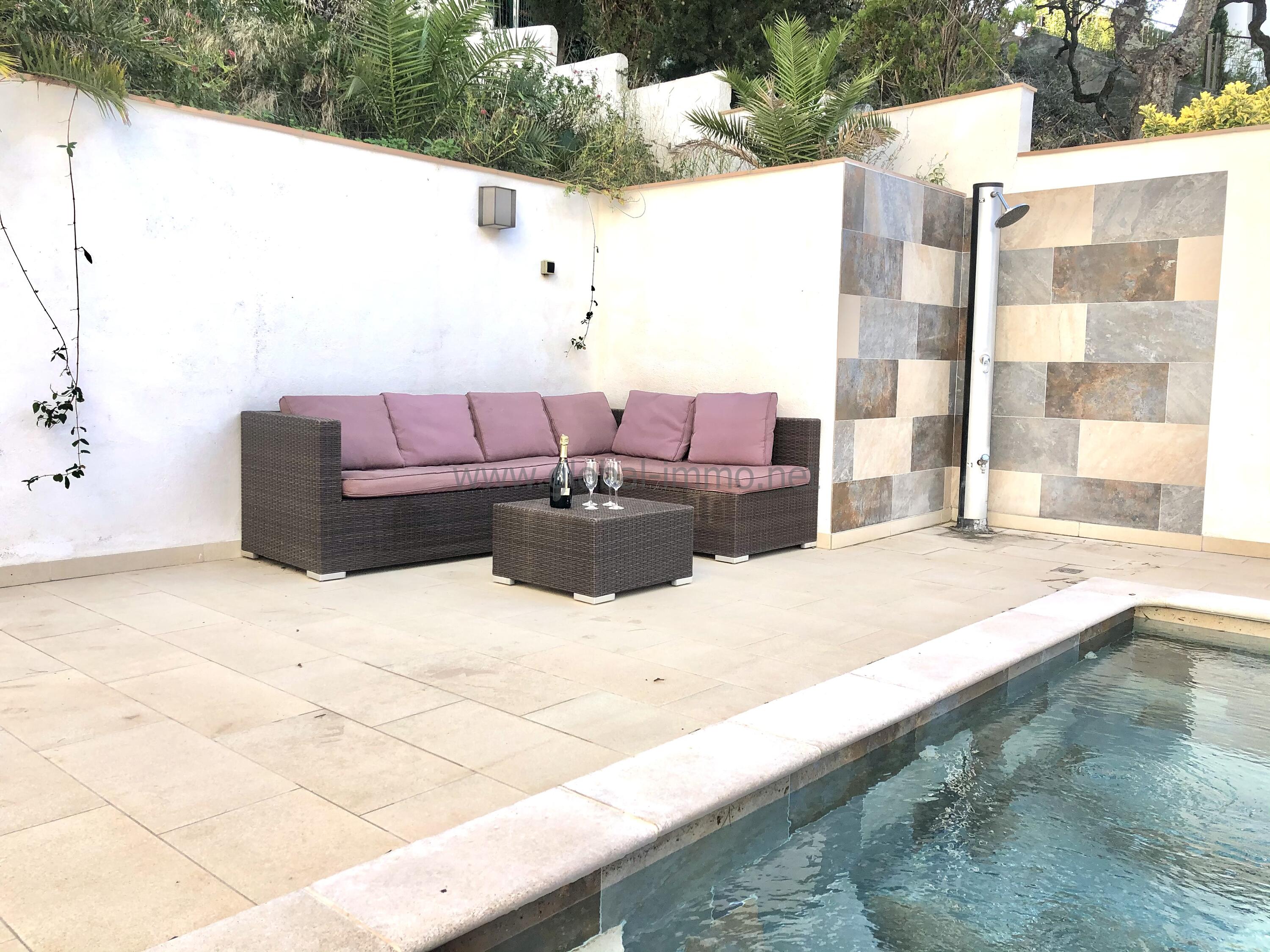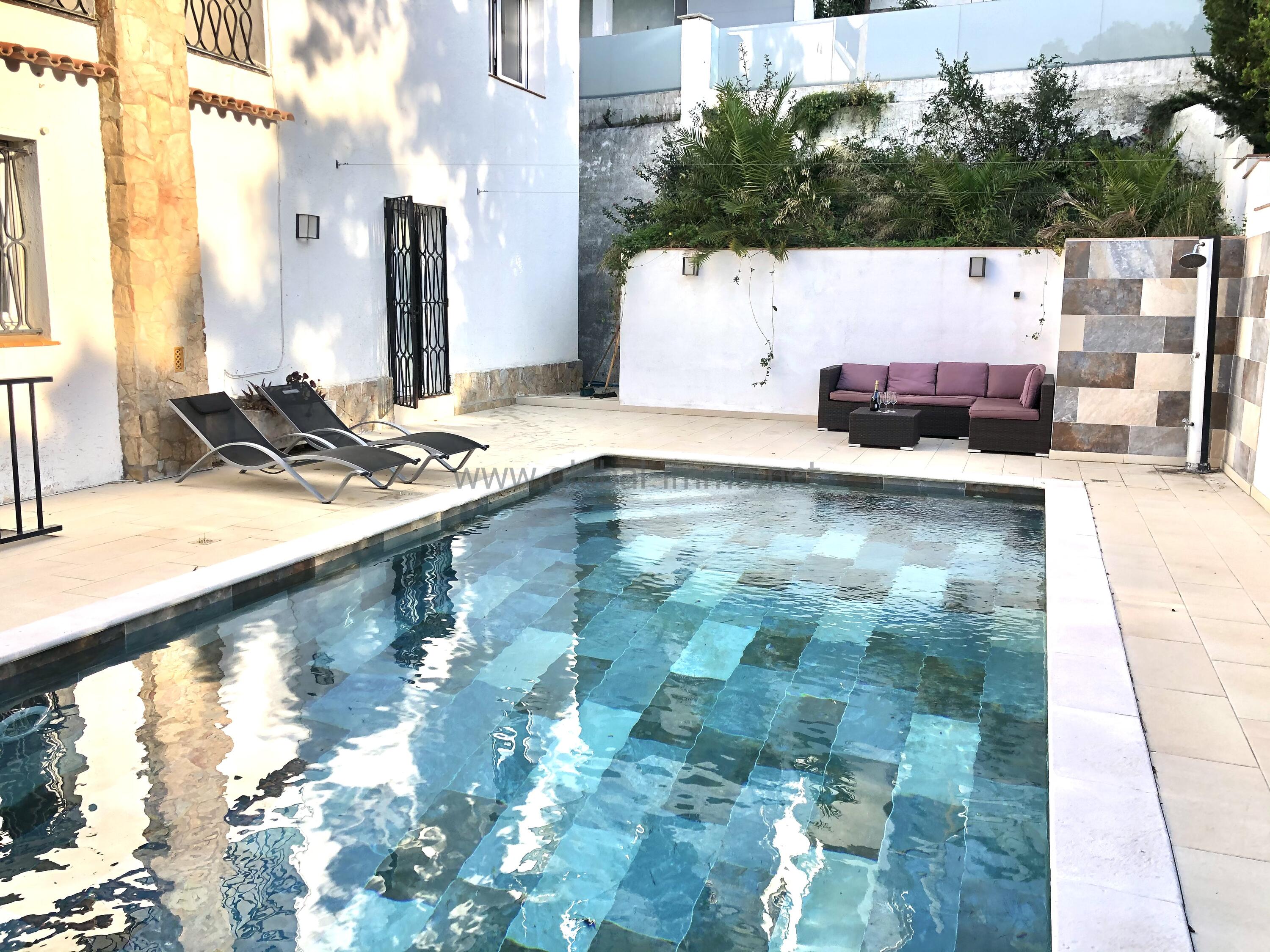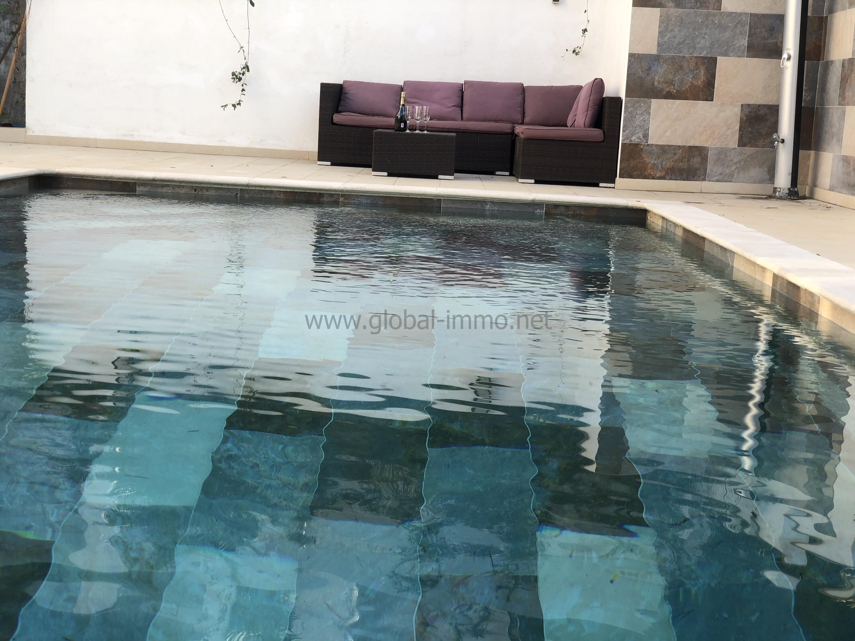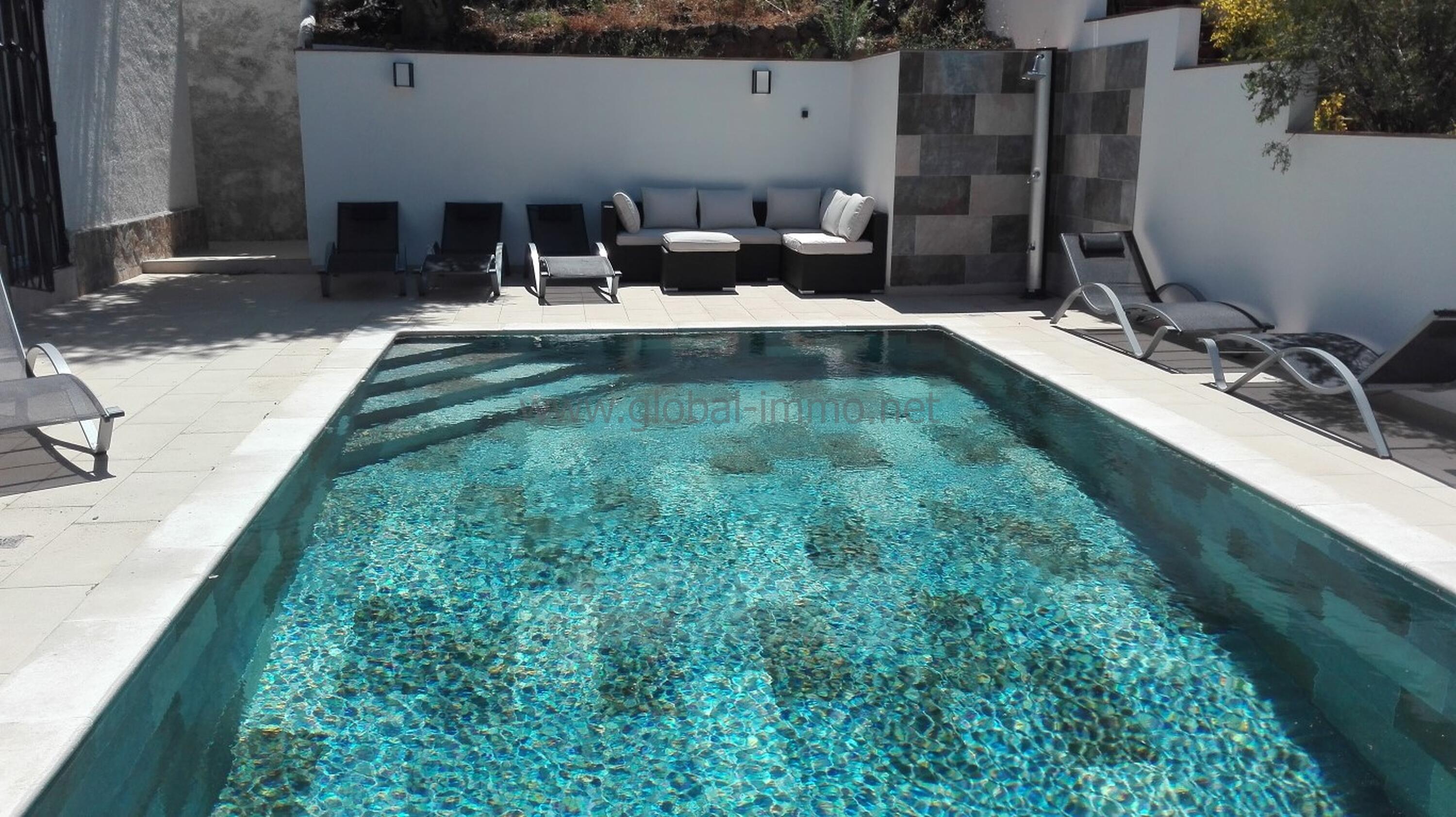 - Piscine d’eau salée de 4x8 m avec transats et canapés